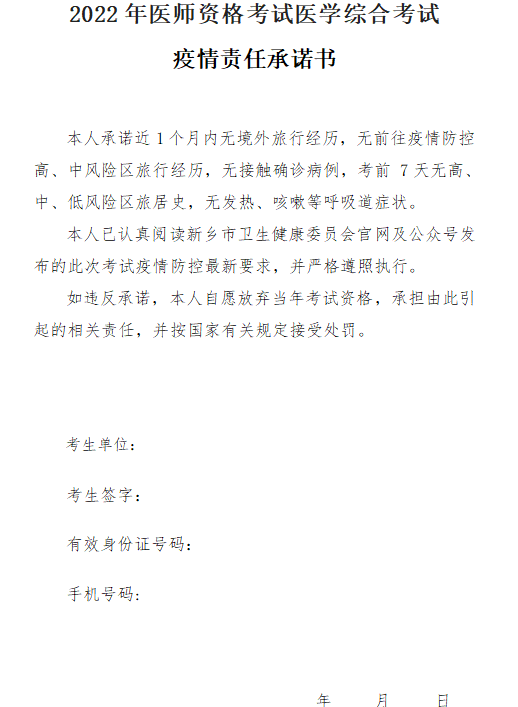 河南省新鄉(xiāng)市2022年醫(yī)師資格考試醫(yī)學(xué)綜合考試疫情責(zé)任承諾書