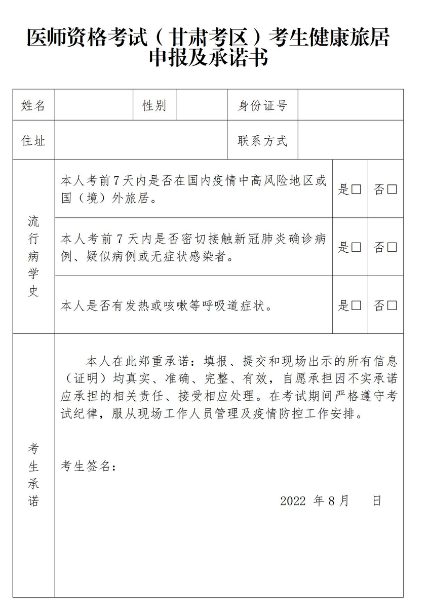 1.考生體溫正常(<37.3℃),“健康新甘肅”健康碼顯示“綠碼”、行程卡正常,提供考前3天2次核酸陰性檢測結(jié)果,持24小時內(nèi)核酸檢測陰性證明及《醫(yī)師資格考試(甘肅考區(qū))考生健康旅居申報及承諾書》方可參加考試。