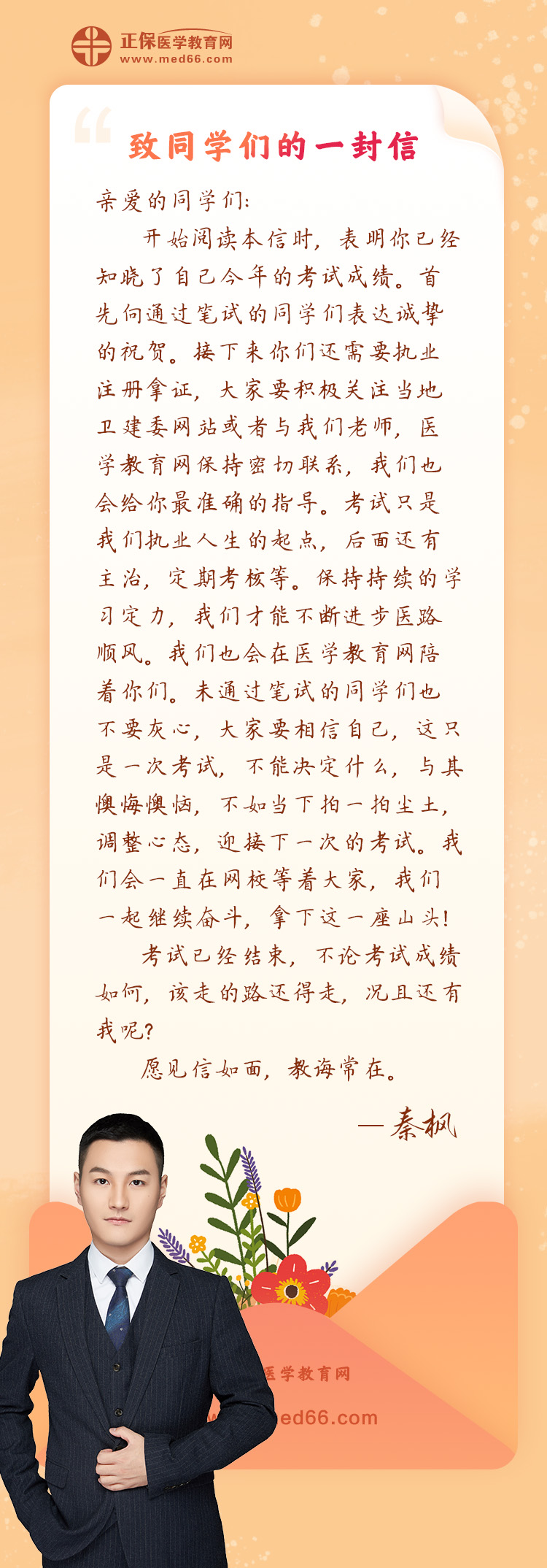2023年醫(yī)師資格考試成績查詢入口開通(快速查分>>)后,醫(yī)學教育網在這里恭喜各位考生順利通過考試!同時老師們也在心心念念著各位同學,紛紛為大家送上了“祝福和囑托”,快來看看秦楓老師都對我們說了哪些內容: