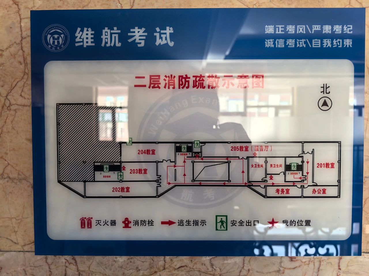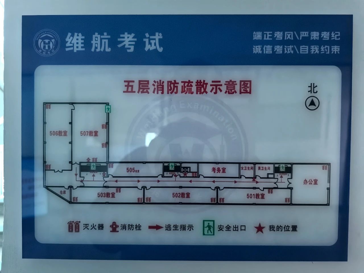 進入考場大樓后請考生仔細查看消防通道指引圖(每個樓層及教室均有展示),熟悉消防通道位置,在考試期間如遇突發(fā)情況,請聽從工作人員引導,有序快速撤離。