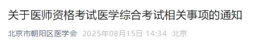 北京朝陽區(qū)2025年醫(yī)師資格綜合考試相關(guān)事項(xiàng)的通知