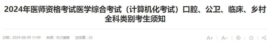 2024年醫(yī)師資格考試醫(yī)學(xué)綜合考試(計(jì)算機(jī)化考試)口腔、公衛(wèi)、臨床、鄉(xiāng)村全科類別考試時(shí)間為8月16日—18日。為做好考試期間有關(guān)工作,現(xiàn)將有關(guān)要求告知如下,請全體考生遵守執(zhí)行。