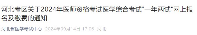 河北省2024醫(yī)師資格“一年兩試”報名考試安排已公布,速看!請相關(guān)考生及時查看通知內(nèi)容,按時做好報名繳費準(zhǔn)備工作!