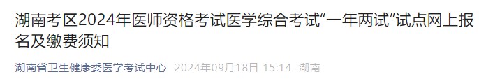 根據(jù)國家醫(yī)師資格考試工作安排,2024年湖南考區(qū)將開展醫(yī)師資格考試醫(yī)學(xué)綜合考試“一年兩試”試點工作(以下簡稱“二試”),為確保各位考生順利報名及繳費(fèi),請仔細(xì)閱讀以下內(nèi)容: