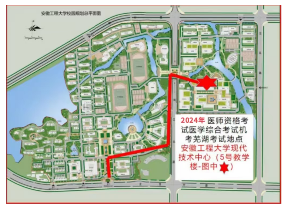 2024年度醫(yī)師資格考試醫(yī)學綜合考試(二試)即將開始,此次蕪湖考點考場依然設置在安徽工程大學(蕪湖市北京中路)現(xiàn)代技術中心(5號教學樓)。具體路線見下圖: