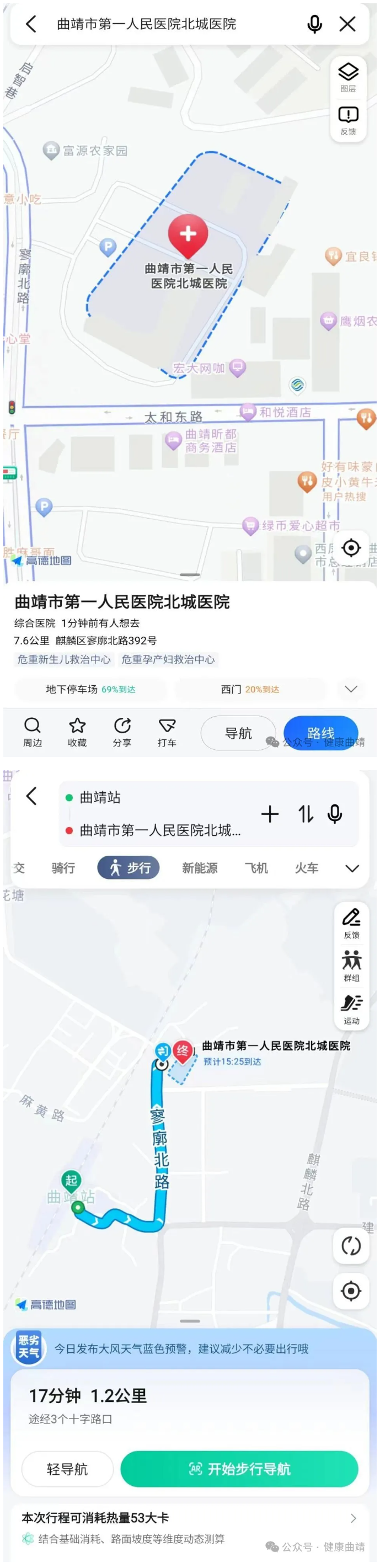 2.自駕或出租車路線:自駕車或打車需從曲靖市區(qū)→曲靖市第一人民醫(yī)院北城醫(yī)院到達。