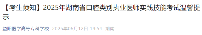 湖南省2025年口腔類別醫(yī)師資格實(shí)踐技能考生須知已公布,請相關(guān)考生及時(shí)查看,做好應(yīng)試準(zhǔn)備!