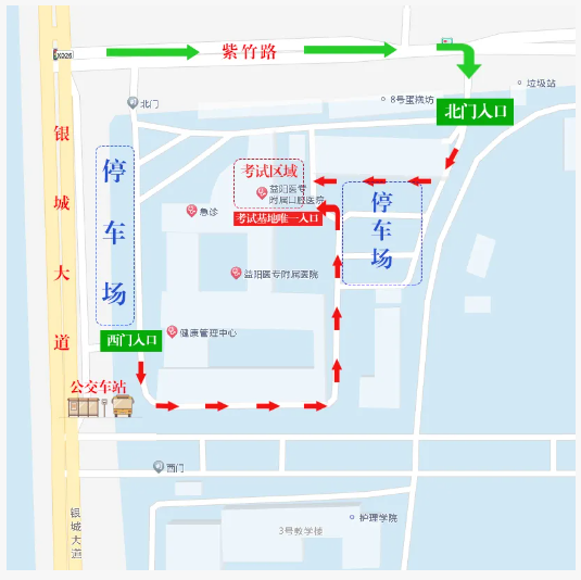 考生車輛可停放至益陽醫(yī)專校內(nèi)。為避免考場區(qū)域擁堵,建議各位考生盡量選擇綠色出行。