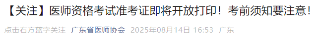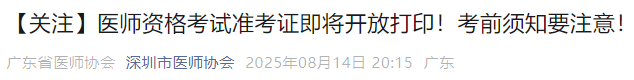 廣東深圳2025年醫(yī)師資格綜合筆試考生速看考前須知!廣東省2025年醫(yī)師資格綜合筆試準(zhǔn)考證8月15日起打印,請(qǐng)相關(guān)考生及時(shí)查看,做好應(yīng)試準(zhǔn)備!