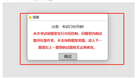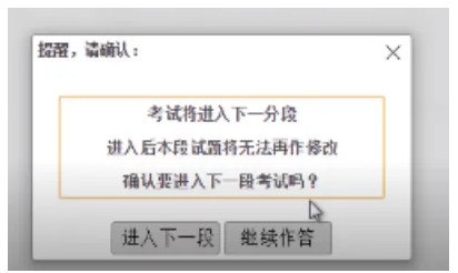 3、考試過(guò)程中,在當(dāng)前題型還存在未完成作答的題目時(shí),考生操作試題分段切換時(shí),系統(tǒng)會(huì)提醒: