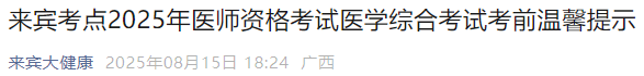 廣西來賓2025年醫(yī)師資格綜合筆試考場安排已定,考生速看!以下為來賓考點官方通知,請相關(guān)考生按時打印準考證,提前確認好考場安排及考生須知!