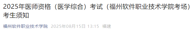 福州軟件職業(yè)技術(shù)學(xué)院考場2025年醫(yī)師資格綜合筆試考場安排已公布!以下為考點(diǎn)官方通知,請(qǐng)相關(guān)考生按時(shí)打印準(zhǔn)考證,提前確認(rèn)好考場安排及考生須知!