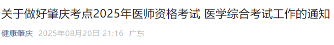 廣東肇慶2025年醫(yī)師資格綜合筆試考生速看考場地址及考生須知!以下為肇慶考點官方通知,請相關(guān)考生按時打印準(zhǔn)考證,提前確認(rèn)好考場安排及考生須知!