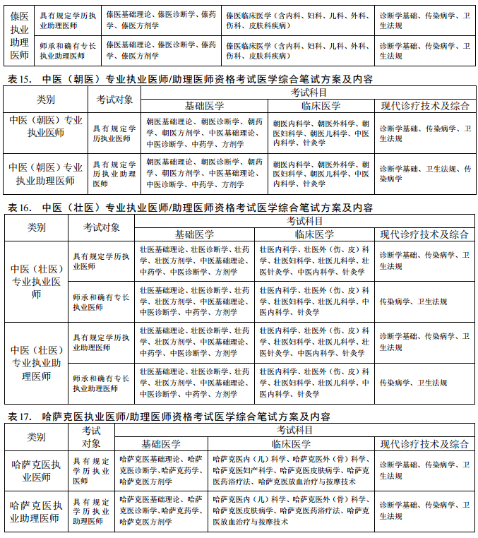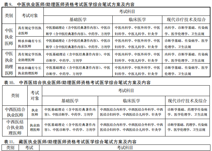 中醫(yī)類醫(yī)師資格考試醫(yī)學(xué)綜合筆試內(nèi)容、考試形式以原衛(wèi)生部醫(yī)師資格考試委員會審定頒布的《醫(yī)師資格考試大綱(中醫(yī)、民族醫(yī)、中西醫(yī)結(jié)合醫(yī)師)》為依據(jù)。執(zhí)業(yè)醫(yī)師和執(zhí)業(yè)助理醫(yī)師考試方案及內(nèi)容見表9—表17!