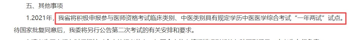 江西省衛(wèi)健委發(fā)布2021年江西省衛(wèi)生健康委員會公告(2021 年第1號)通知:江西省將積極申報參與醫(yī)師資格考試臨床類別、中醫(yī)類別具有規(guī)定學(xué)歷中醫(yī)醫(yī)學(xué)綜合考試“一年兩試”試點。待國家批復(fù)同意后,江西衛(wèi)健委將另行公告第二次考試的有關(guān)安排和要求。