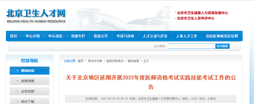 為統(tǒng)籌做好新冠肺炎疫情防控和醫(yī)師資格考試工作,2022年北京考區(qū)醫(yī)師資格考試實踐技能考試延期至7月中、下旬組織舉行,具體考試時間、考試地點以準考證為準,7月4日開始打印準考證。