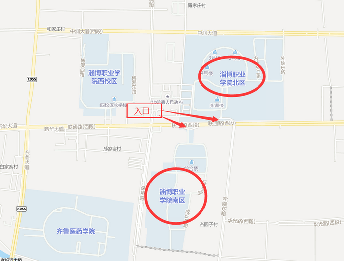 2020年國(guó)家醫(yī)師資格醫(yī)學(xué)綜合考試將在淄博職業(yè)學(xué)院南、北兩個(gè)校區(qū)進(jìn)行,請(qǐng)各相關(guān)考生提前查看準(zhǔn)考證上的考試地點(diǎn),以免走錯(cuò)影響考試。淄博職業(yè)學(xué)院校區(qū)示意圖: