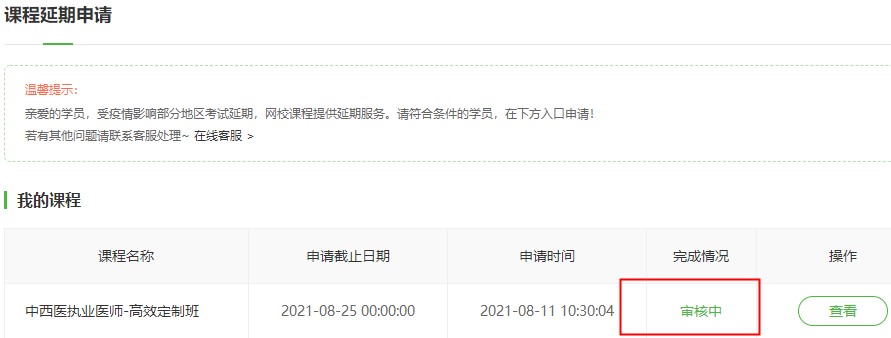 5.您的延期申請將會自動進(jìn)入網(wǎng)校后臺審核,網(wǎng)校工作人員會盡快幫您審核,請您耐心等待。