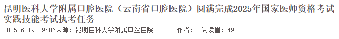共3702名考生在昆明醫(yī)科大學(xué)附屬口腔醫(yī)院完成2025年口腔醫(yī)師實(shí)踐技能考試,以下為官方報(bào)道內(nèi)容: