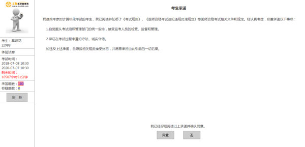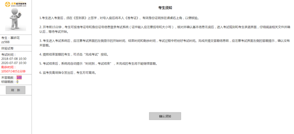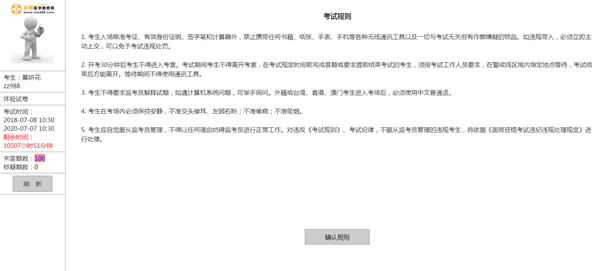 在考生基本信息頁面,點擊“確認”按鈕進入考試規(guī)則及考生承諾頁面。在認真閱讀此頁面信息后依次點擊下方的按鈕進入下一頁面。 點擊“進入考試”后,如全國統(tǒng)一考試時間已到,則進入試題頁面。如統(tǒng)一考試時間未到,則顯示“還有**分鐘開始考試”的提示。