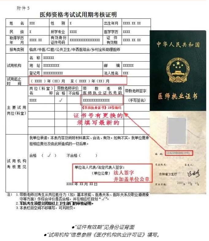 5、試用期合格證明:打印《醫(yī)師資格考試試用期考核證明》附件5(請登錄國家醫(yī)學(xué)考試網(wǎng)考生服務(wù)系統(tǒng)下載),須由試用單位法定代表人簽字并加蓋單位公章;