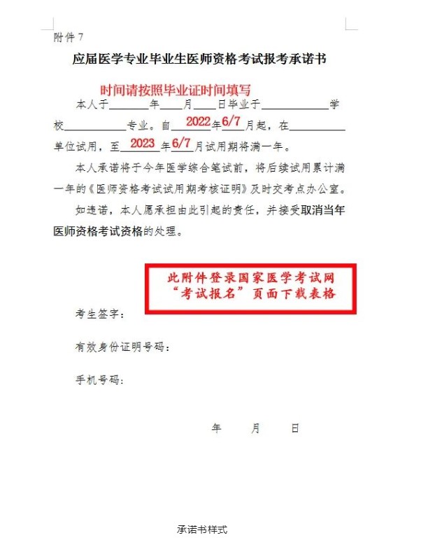 9、應(yīng)屆畢業(yè)生還需提供《應(yīng)屆醫(yī)學(xué)專業(yè)畢業(yè)生醫(yī)師資格考試報考承諾書》,請登錄國家醫(yī)學(xué)考試網(wǎng)考生服務(wù)系統(tǒng)下載;