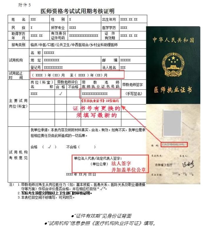 5、試用期合格證明:打印《醫(yī)師資格考試試用期考核證明》附件5(請登錄國家醫(yī)學考試網(wǎng)考生服務系統(tǒng)下載),須由試用單位法定代表人簽字并加蓋單位公章;