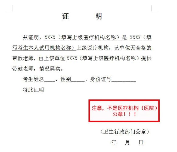 須用上級(jí)醫(yī)療機(jī)構(gòu)的帶教老師資格證與執(zhí)業(yè)證復(fù)印件并加蓋公章,考核證明需加蓋上級(jí)機(jī)構(gòu)和本人所在單位公章各一個(gè)(兩個(gè)章),并出具醫(yī)聯(lián)體證明,并加蓋衛(wèi)生行政部門公章,無證明的需填寫附件《上級(jí)醫(yī)療機(jī)構(gòu)出具帶教老師的證明》加蓋衛(wèi)生行政部門公章,附件下載方式見文末)