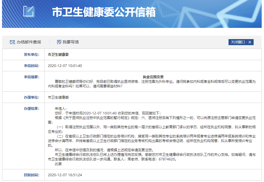 提問:尊敬的衛(wèi)健委領導你們好,我目前已取得執(zhí)業(yè)醫(yī)師資格,注冊范圍為外科專業(yè)。請問我參加內科或者全科規(guī)培后可以變更執(zhí)業(yè)范圍為內科或者全科嗎?如果可以,請問需要哪些材料?