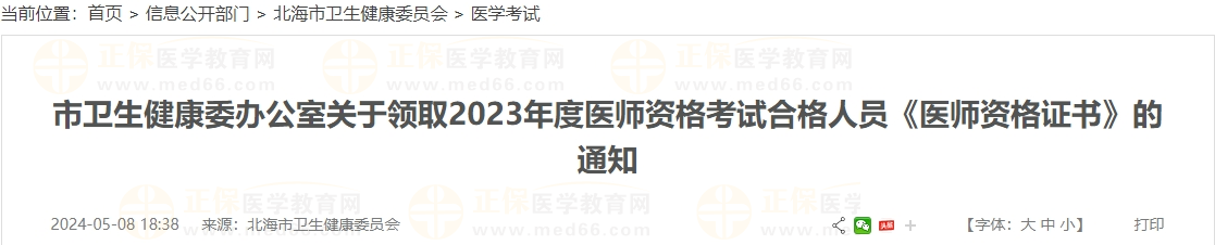 廣西北海市關(guān)于領(lǐng)取2023年度醫(yī)師資格考試合格人員《醫(yī)師資格證書》的通知