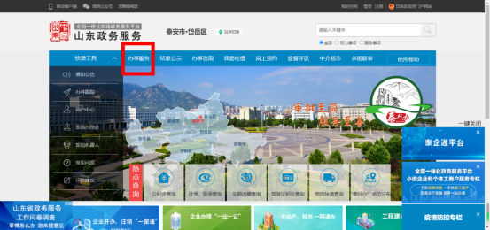 1.打開山東政務(wù)服務(wù)網(wǎng),站點(diǎn)選擇泰安——岱岳區(qū),點(diǎn)擊辦事服務(wù)選項(xiàng);