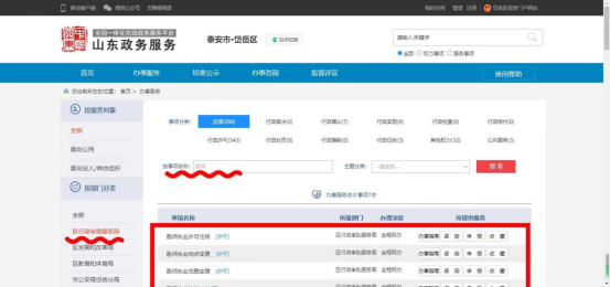 2.點(diǎn)擊岱岳區(qū)行政審批服務(wù)局,按事項(xiàng)名稱搜索,點(diǎn)擊相關(guān)事項(xiàng);