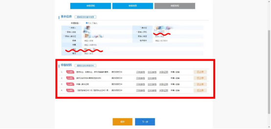 5.補(bǔ)充必填項(xiàng)信息,將必要材料上傳或關(guān)聯(lián)證照后點(diǎn)擊下一步;