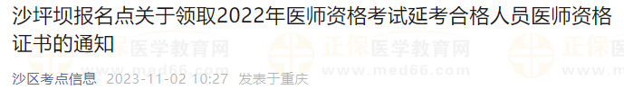 沙坪壩報(bào)名點(diǎn)關(guān)于領(lǐng)取2022年醫(yī)師資格考試延考合格人員醫(yī)師資格證書的通知