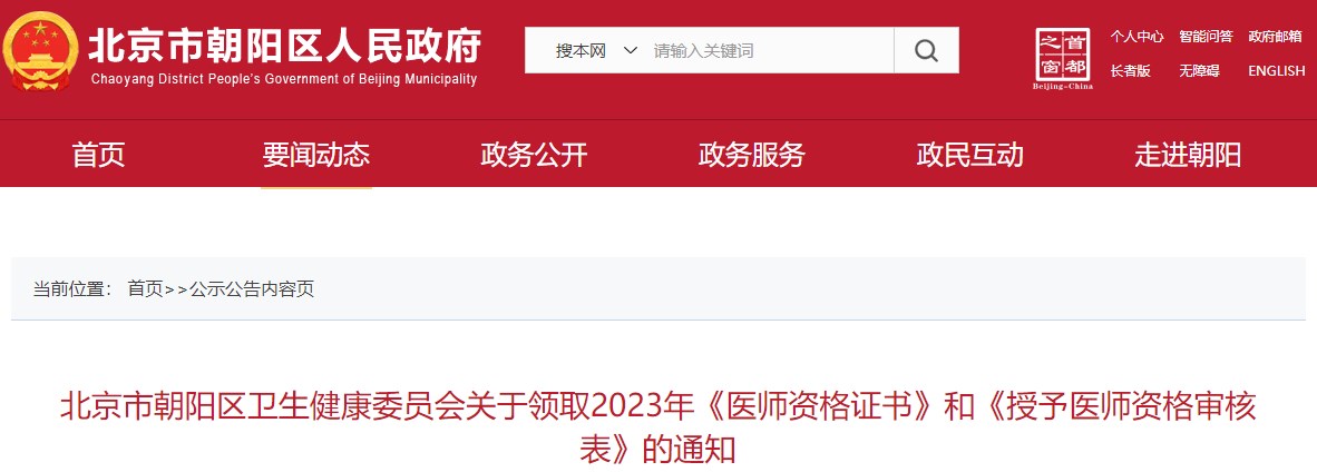 北京市朝陽區(qū)衛(wèi)生健康委員會關(guān)于領(lǐng)取2023年《醫(yī)師資格證書》和《授予醫(yī)師資格審核表》的通知
