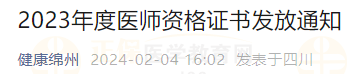 2月5日開始領??!四川綿陽考點2023年度醫(yī)師資格證書發(fā)放通知