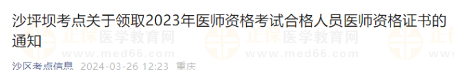 沙坪壩考點(diǎn)關(guān)于領(lǐng)取2023年醫(yī)師資格考試合格人員醫(yī)師資格證書的通知