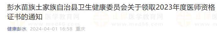 重慶彭水苗族土家族自治縣關(guān)于領(lǐng)取2023年度醫(yī)師資格證書的通知