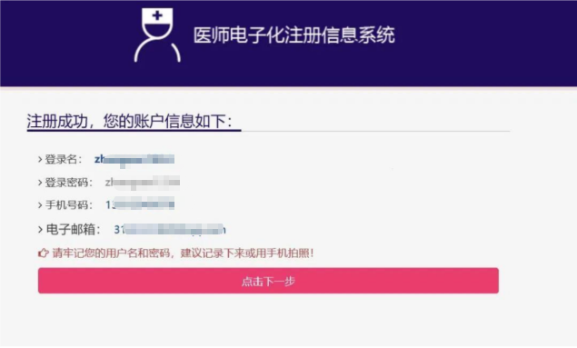 (4)電子化賬戶(hù)注冊(cè)成功,點(diǎn)擊【點(diǎn)擊下一步】按鈕即可進(jìn)行登錄。(請(qǐng)牢記您的用戶(hù) 名和密碼,建議記錄下來(lái)或手機(jī)拍照)