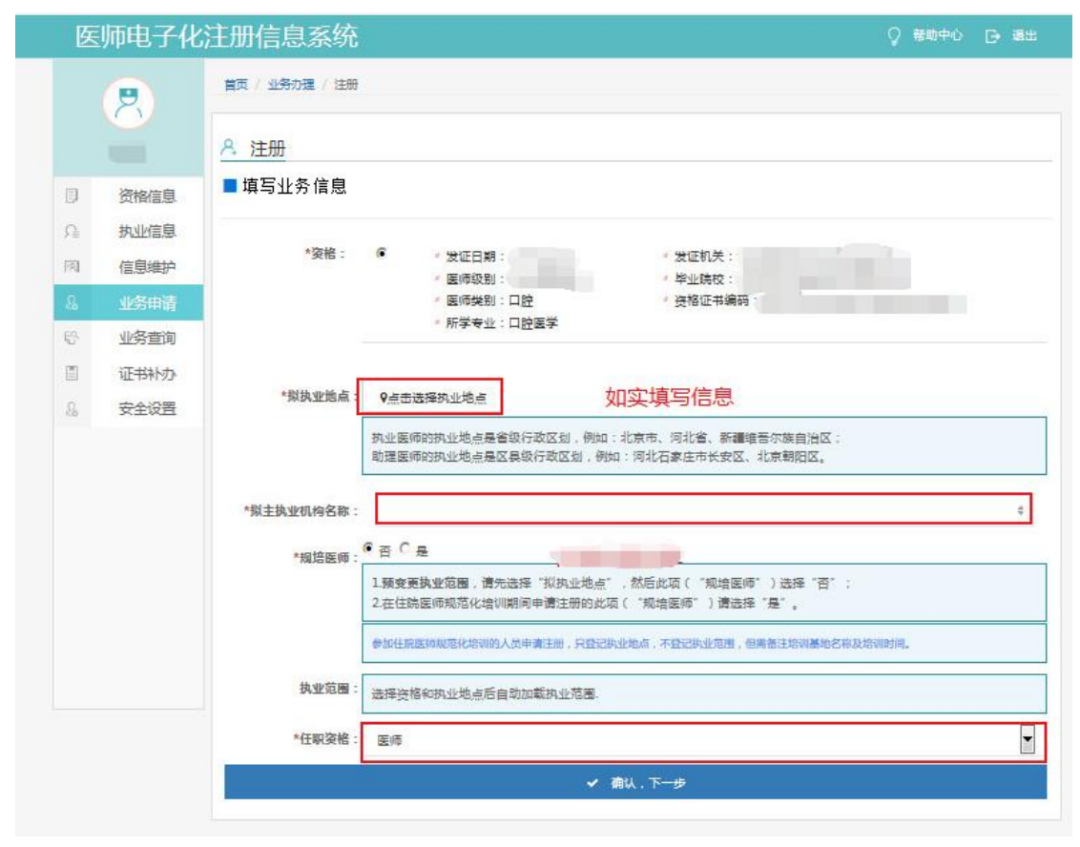 選擇執(zhí)業(yè)地點(diǎn)、選擇主執(zhí)業(yè)機(jī)構(gòu)、規(guī)培醫(yī)師選擇“否”,執(zhí)業(yè)范圍、任職資格等,填寫(xiě)完成后,點(diǎn)擊“確認(rèn),下一步”。