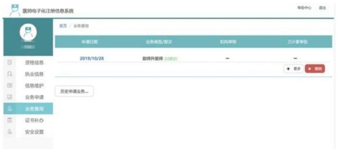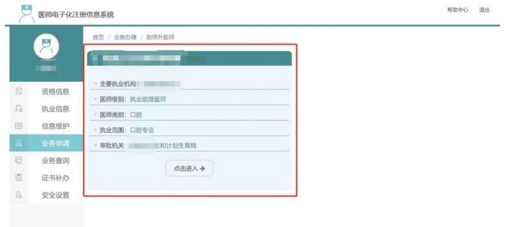 (2)助理升執(zhí)業(yè)(同一個(gè)醫(yī)療機(jī)構(gòu)),點(diǎn)擊業(yè)務(wù)申請(qǐng),選擇助理升執(zhí)業(yè)。