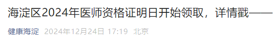 海淀區(qū)2024年醫(yī)師資格證明日開(kāi)始領(lǐng)取,詳情戳——