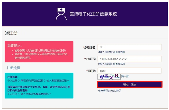 4、填寫注冊(cè)信息,輸入“您的姓名”和“身份證號(hào)”,填寫正確的“驗(yàn)證碼”后,點(diǎn)擊【確定,繼續(xù)】。