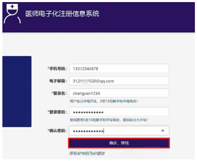 5、填寫“手機(jī)號(hào)”、“電子郵箱”、“登錄名”,正確設(shè)置“登錄密碼”和“確認(rèn)密碼”后,點(diǎn)擊【確定,繼續(xù)】。