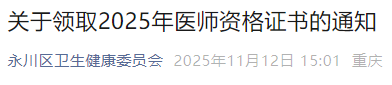 永川區(qū)2025年國(guó)家醫(yī)師資格考試醫(yī)師資格證書領(lǐng)取工作有關(guān)事宜通知如下: