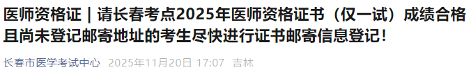 請(qǐng)長(zhǎng)春考點(diǎn)2025年醫(yī)師資格證書(僅一試)成績(jī)合格且尚未登記郵寄地址的考生盡快進(jìn)行證書郵寄信息登記!