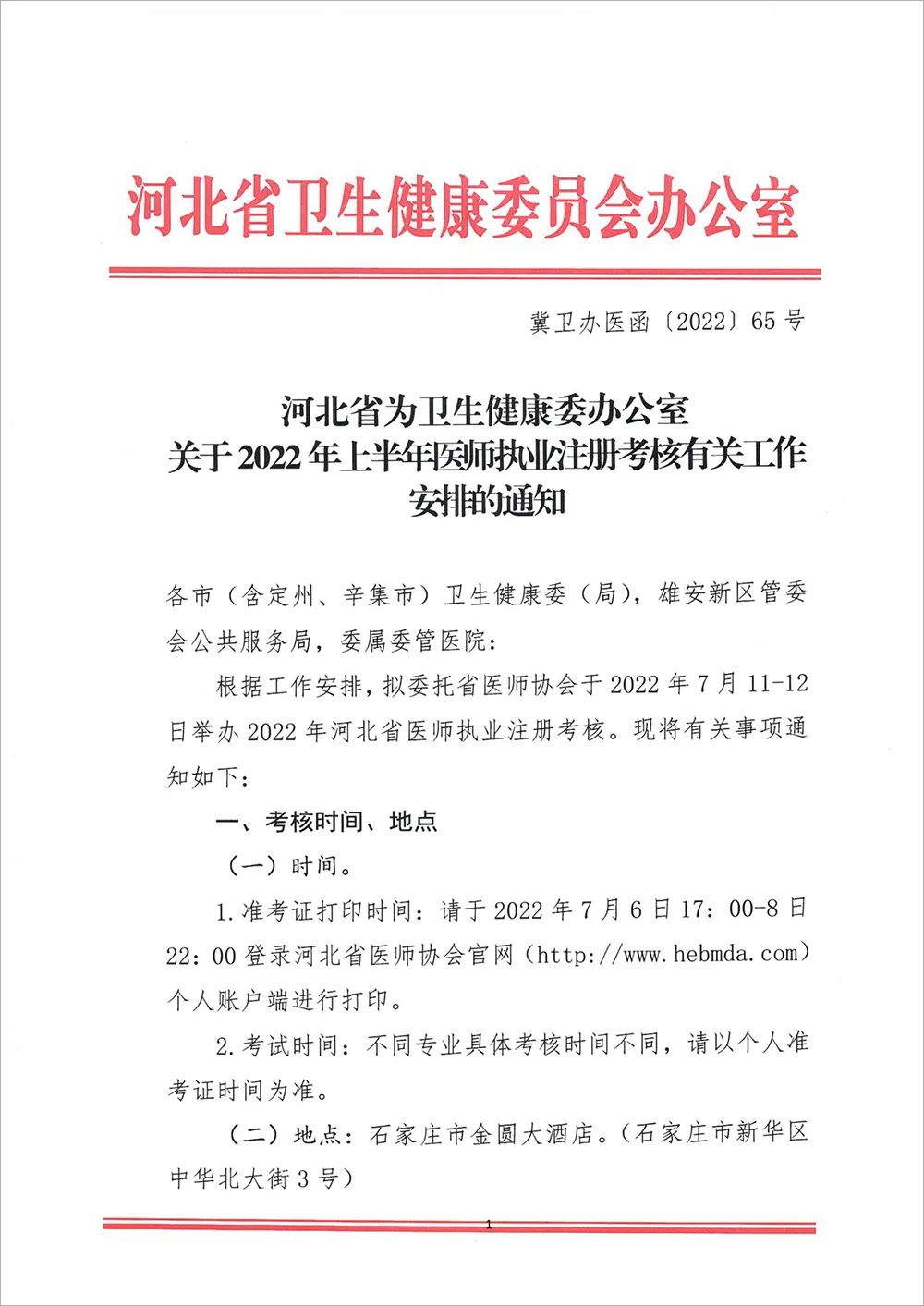 河北考區(qū)關(guān)于2022年上半年醫(yī)師執(zhí)業(yè)注冊考核有關(guān)工作安排的通知