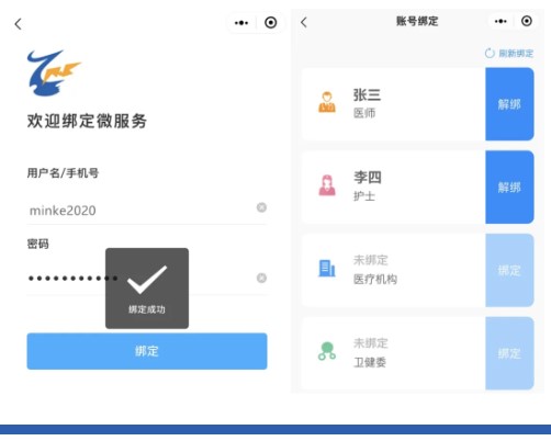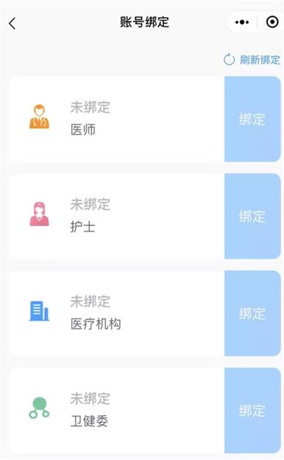 2、在“賬號綁定”界面,醫(yī)師和護士根據(jù)個人身份點擊對應(yīng)位置后的【綁定】按鈕。