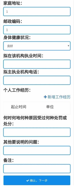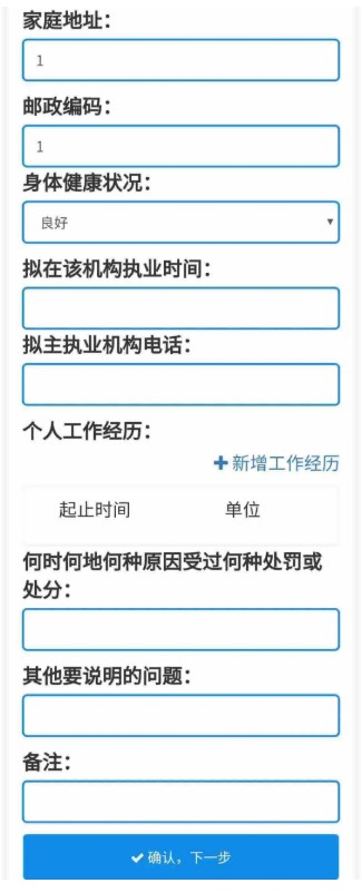 2、填寫業(yè)務信息,變更資格請選擇“是”,選擇變更后注冊要使用的資格,變更執(zhí)業(yè)地點請選擇“是”(由助理的縣區(qū)級區(qū)劃選擇為省級行政區(qū)劃),變更主執(zhí)業(yè)機構選擇“是”,按照要求填寫其他申請內容,填寫完成后,點擊“確認,下一步”
