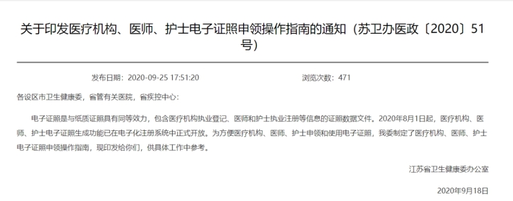 江蘇省醫(yī)療機(jī)構(gòu)、醫(yī)師、護(hù)士電子證照申領(lǐng)操作指南